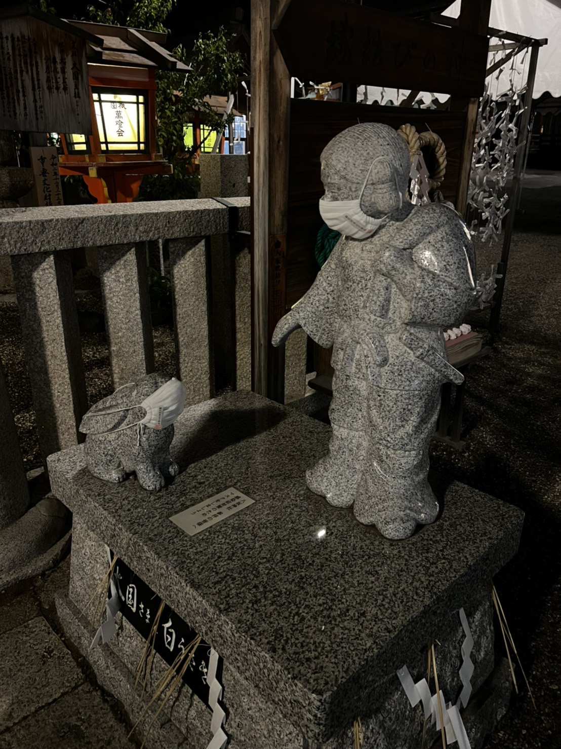 八坂神社の像にもマスクが付けてあり早くコロナが治まれば良いなー