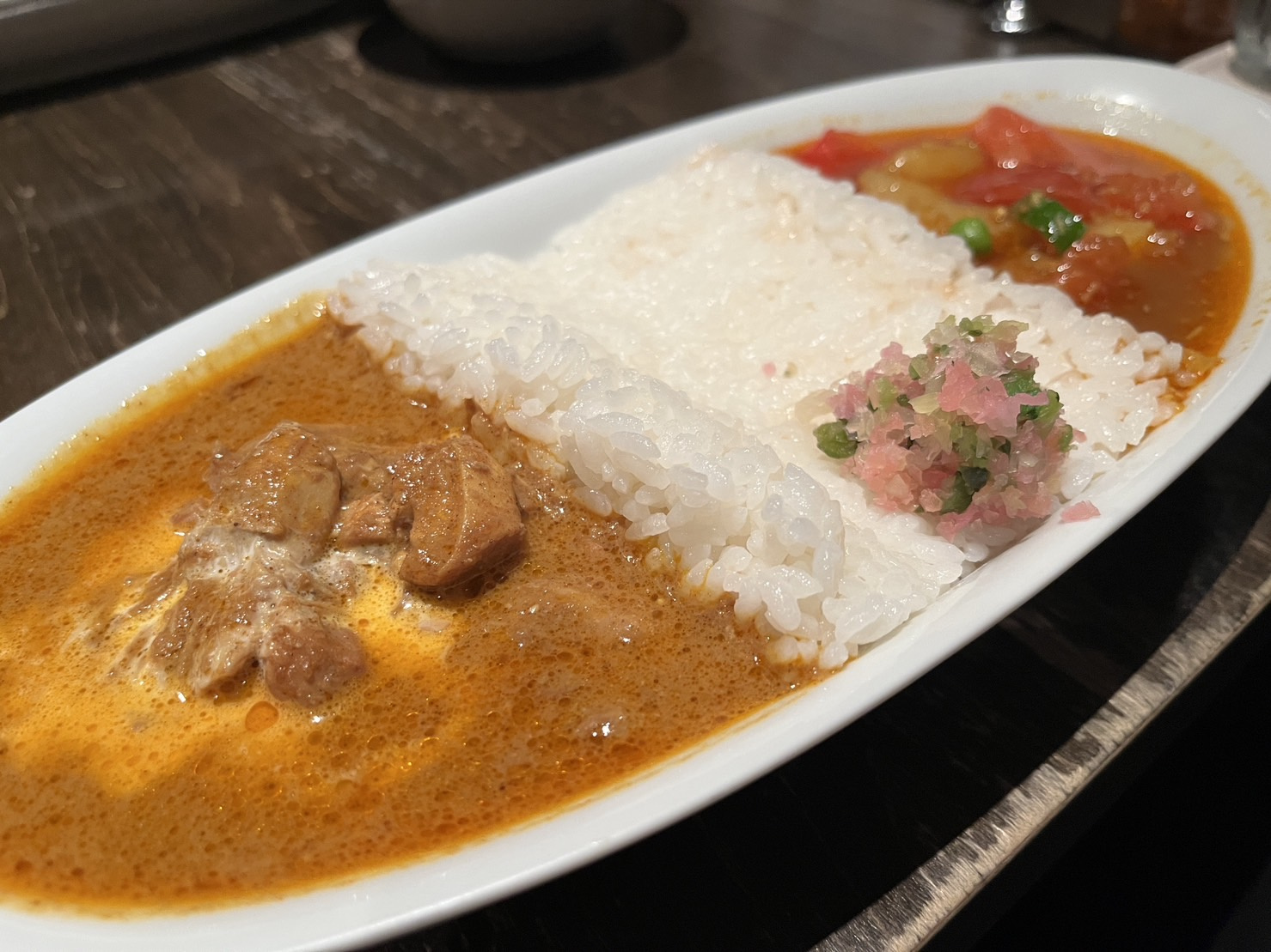 野菜のカレーとバターチキンカレーのコンビネーション