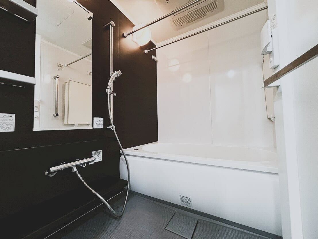 浴室はダークカラーのアクセントパネルと、深みのあるグレーの床が締め色になってスタイリッシュ&ラグジュアリーな雰囲気です。