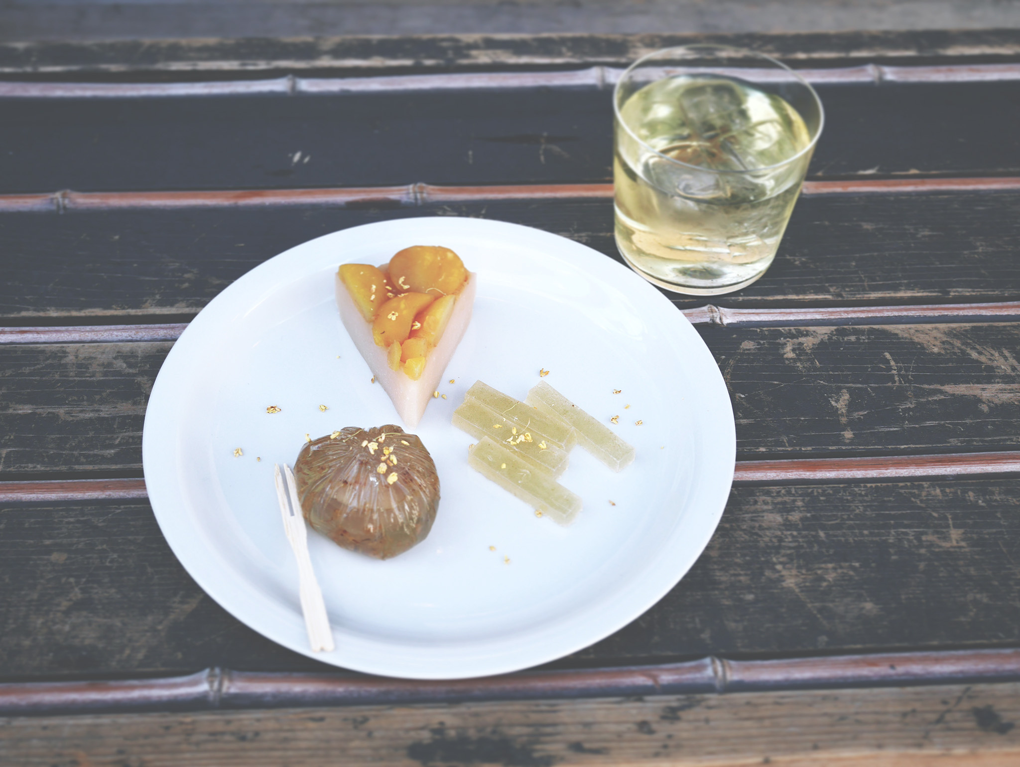キンモクセイのふわっとした甘さのある香りとジンの苦みと緑茶の渋みが合わさって、和菓子とのマリアージュも用意されていて