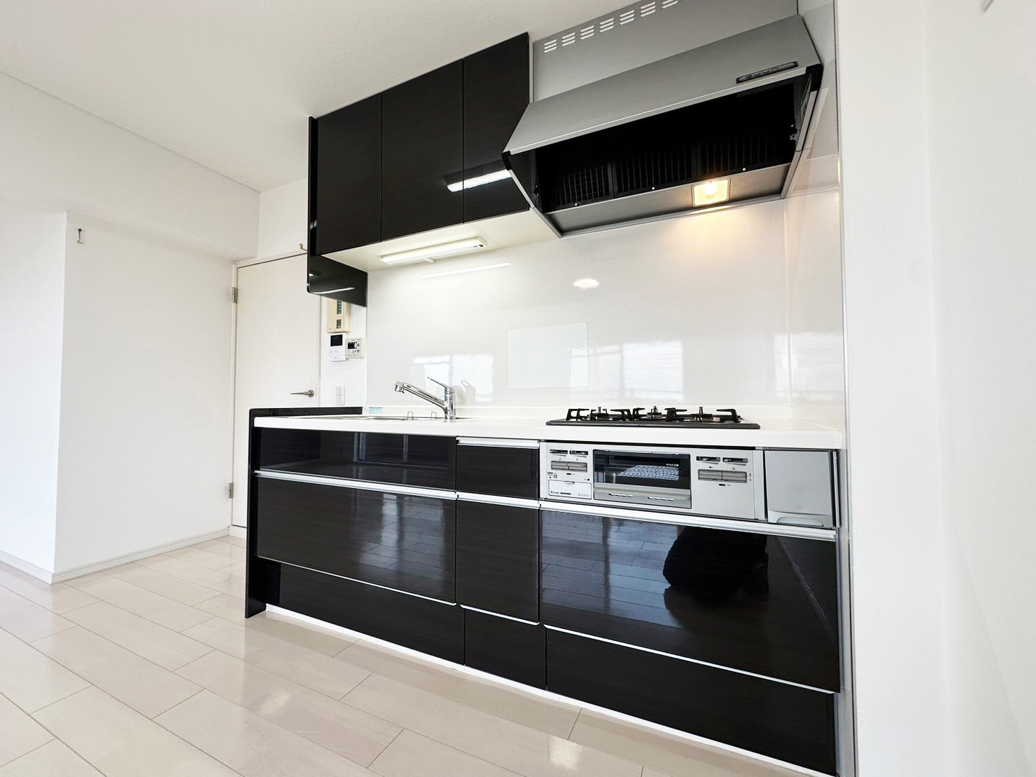 キッチンはブラックの鏡面パネルがスタイリッシュな印象。
