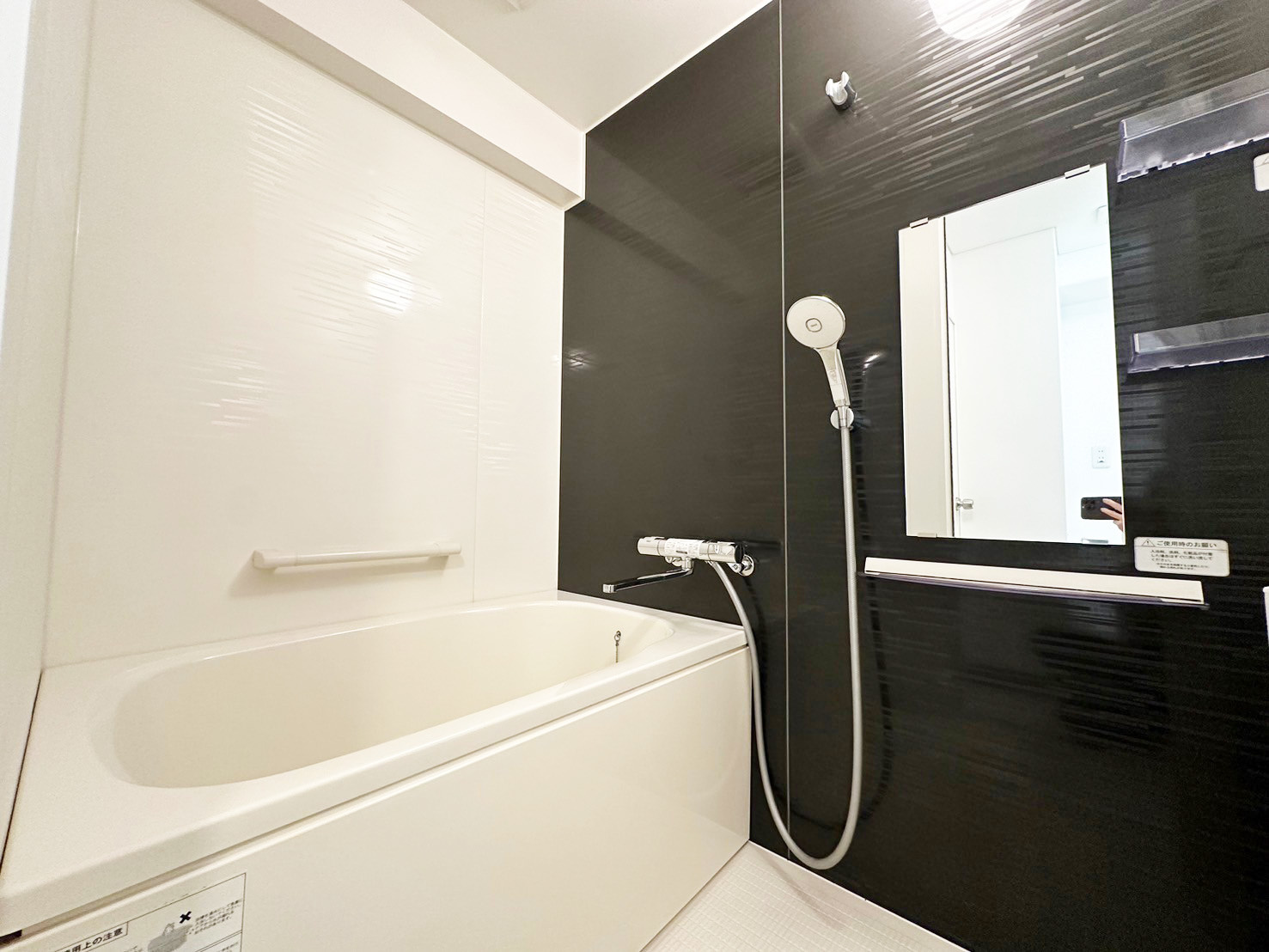 ホワイトの床、ダークグレーのアクセントクロス、ブラックの設備がかっこいいモノトーンデザインが素敵!