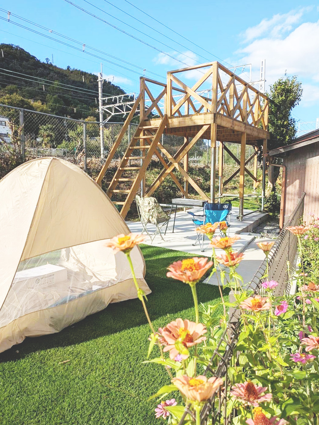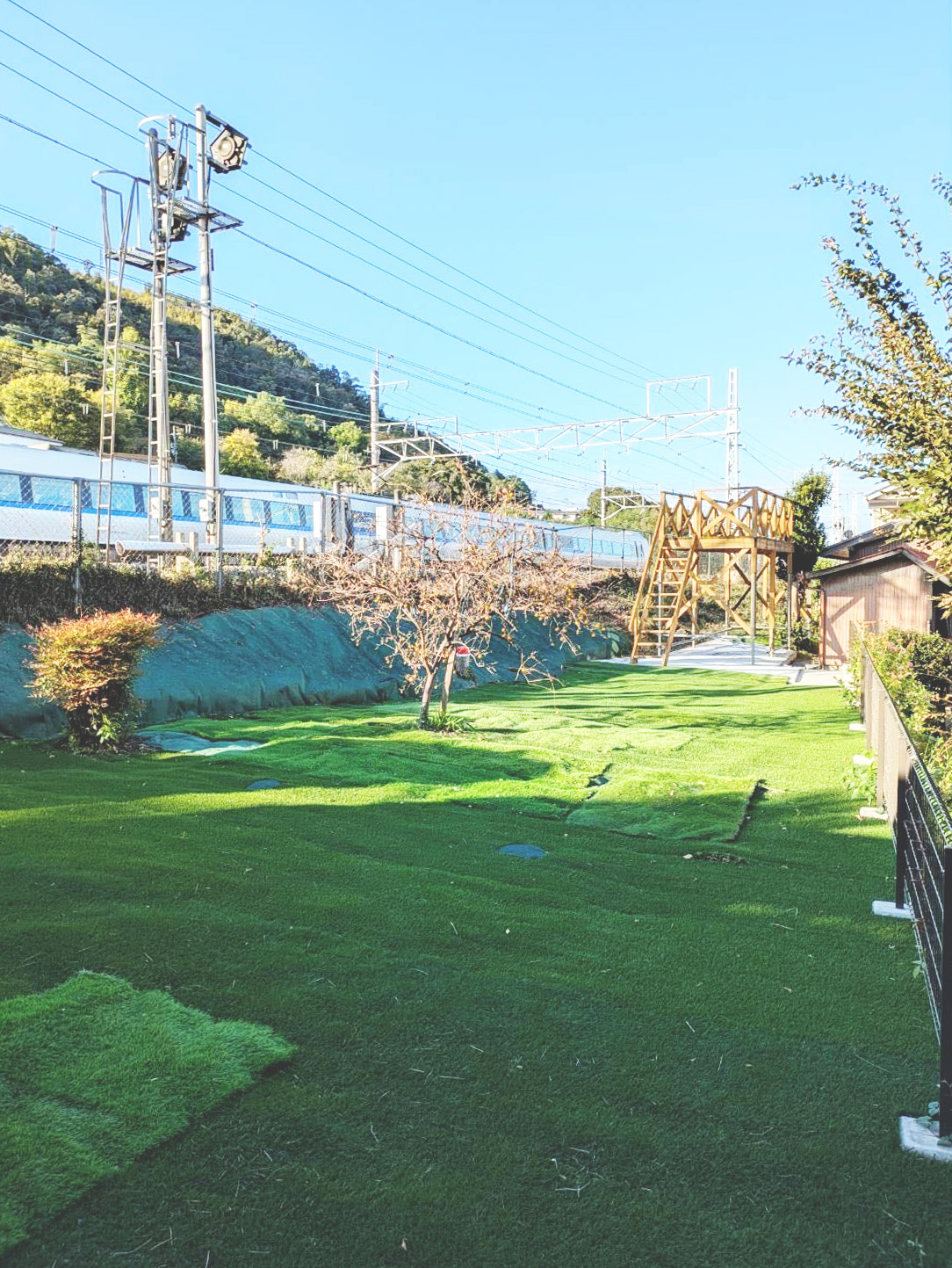高さのあるウッドデッキで、なんと近くにあるJRの線路がとっても良く見えるんです。